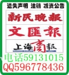 广告登报服务热线021-59131015本公司专业办理《新民晚报》《新闻晨报》《文汇报》《青年报》《解放日报》《上海科技报》《中国税务报》《工人日报》《中国保险报》《中国商报》《中国改革报》《国门时报》专业刊登各类遗失声明、登报声明、企业注销公告、减资公告、清算公告、变更公告、律师声明、严正声明、债权转让通知、催收公告、资产处置拍卖公告、环境影响评估公示、上市辅导公告、吸收合并公告、产品召回公告、企业送达公告、拆迁公告、股东会召开通知。